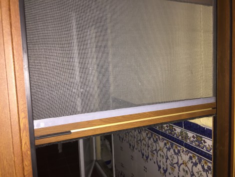 La mosquitera puerta de Mosquiluz se instala fácilmente dentro del hueco y va encajada entre dos soportes anclados al mismo hueco de la puerta en la parte superior e inferior.